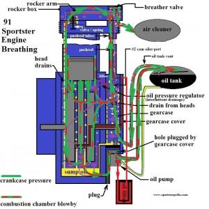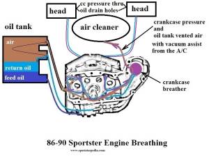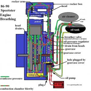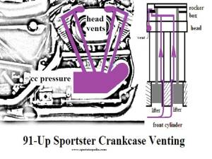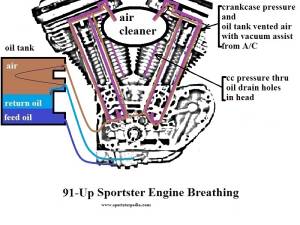 The one way breather style system is more like a car PCV system. 1) Unlike an auto PCV, a Sportster has a faster acting type one way valve.