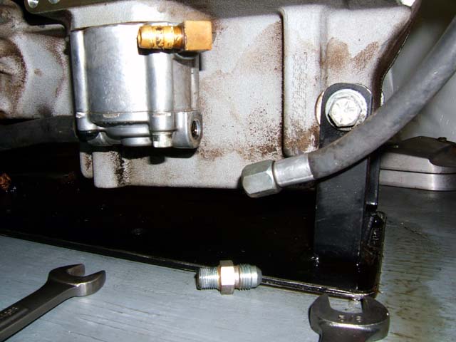 • We'll start by removing the pressure hose. My apologies for people for whom this is all obvious, but you'd be amazed how many people I've run into who don't know what you turn to remove a flare fitting, and end up twisting the hose. Anyway, hold the fitting that's closest to the oil pump with one wrench while you loosen the larger nut. The hose will come off like this.