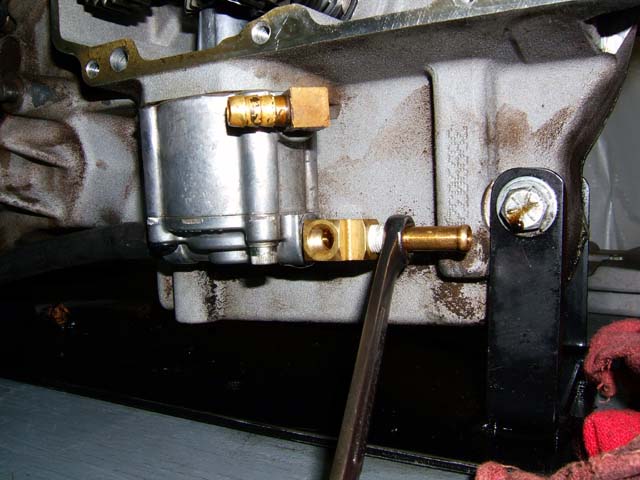 • Your oil pump consists of two sections, a “pressure” section and a “scavenge” section. The pressure section is the bottom area of the pump. On the lower left is the feed line, coming from the oil tank and into the pressure section inlet. We won't be touching this line, just leave it hooked up. On the lower right is the pressure section outlet. This goes through a hose up to the oil filter. On a rubber mount, the pressure side hose is quite a bit shorter than this one (this is a '99 motor), but it's the same deal. From the oil filter, the oil under pressure goes into the engine.