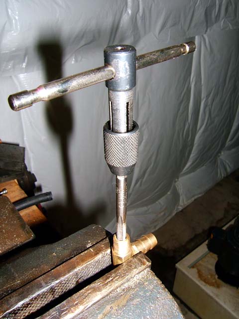 • Next, your going to tap the inside (pipe thread side) of the 1/8” mpt x 3/8“ hose barb fitting.