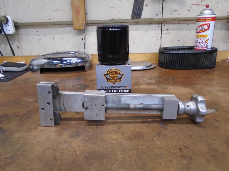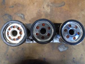 | HD Super Premium 5 Napa Gold 7148 - black version Napa Gold 7348 - chrome version 3) | Baseplates and seals left to right: HD Premium 5 - Napa 7148 - Napa 7348 4) | This tubing cutter style tool was used to cut open the filters. 5) |