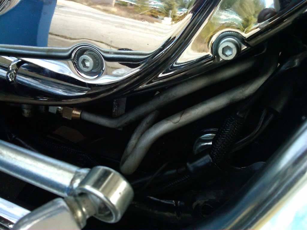 Install the (2) short metal lines to the fittings on the right side of the bike (18mm short wrench).