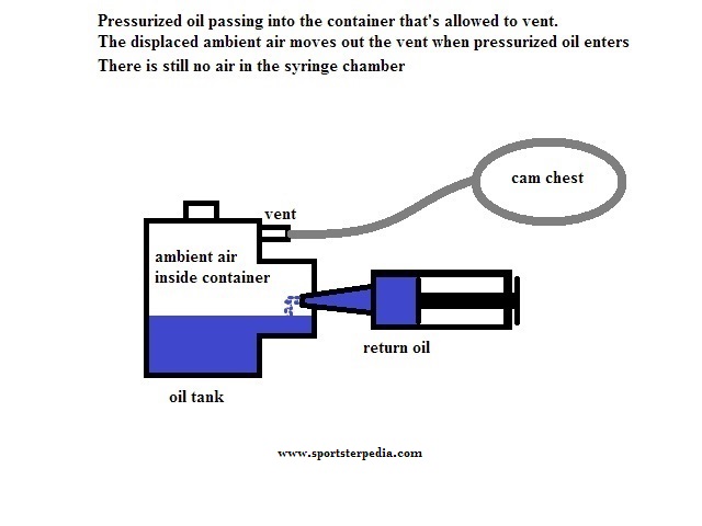 In the drawings below, a syringe is used to example crankcase pressure being applied into the oil tank: