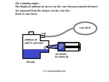 Since it's not the oil pump scavenger's job to separate the oil/air mist, both crankcase pressure and oil end up in the oil tank. 9)