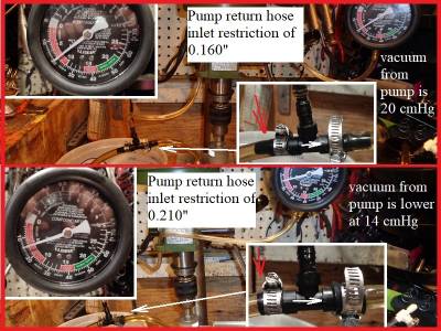 The hose fitting is a restriction where flow (from vacuum)of pump gear action lowers static on the hose pressure.