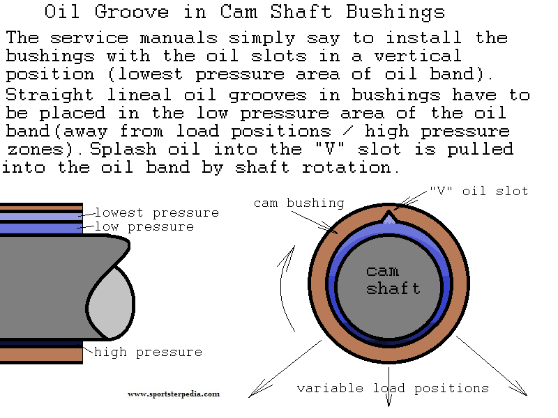 Evo cam shaft bushings in the cam chest have linear oil “V” slots machined into them. The slot is there to add oil to the oil band between shaft and bushing.