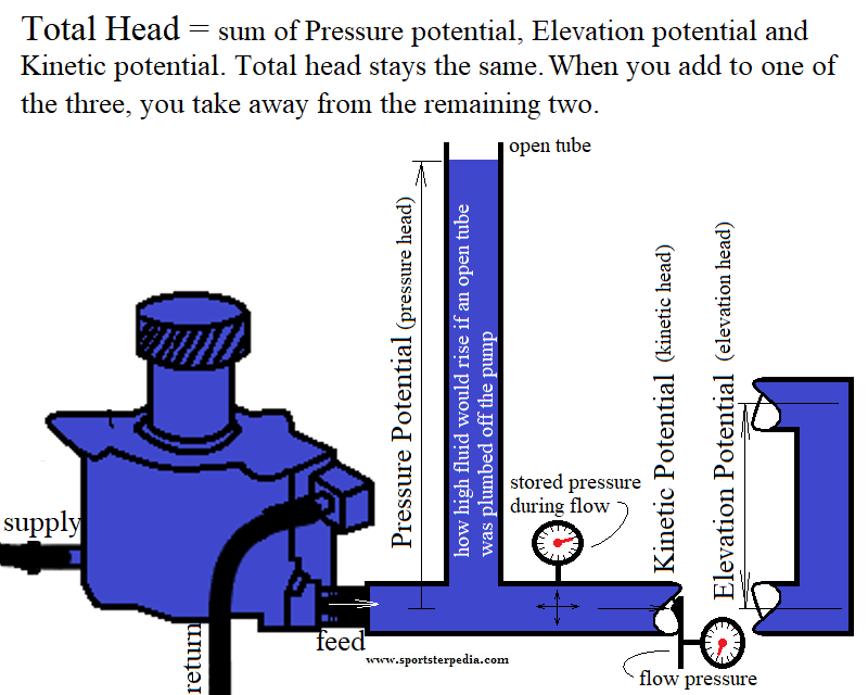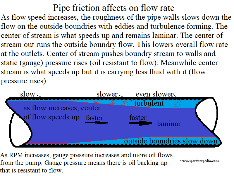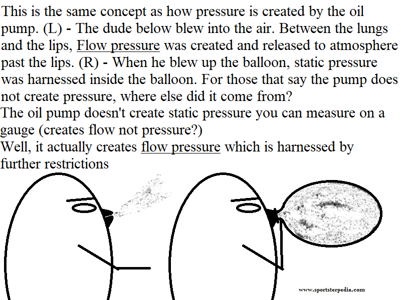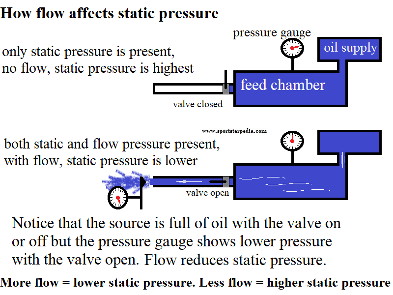 - The source (oil pump) creates pressure by the closing of the gear teeth at the outlet and forcing that oil into the feed hose. The hose ID is a restriction to the pump outlet as well is the friction on the oil going through the hose and the length of the hose. Static pressure rises in the feed hose. This is a “working pressure” and not total pressure. The only way to find total pressure is to block all the outlets. But that would just end up breaking the pump since the pump is not regulated and will continue sending flow and building pressure. The static pressure indicated on the gauge shows the effort required by the pump to move the oil, creating the flow required by the system to provide the correct amount of oil to the lubricating points. The pressure indicated on the gauge near the pump is not the same pressure between the parts of the system (at rod bearings or rocker arm bushings etc). Since RPM controls the amount of flow, the static oil pressure will always be fluent (there is no constant amount of head pressure from the pump except maybe in a perfect controlled environment). Even at idle, the oil is changing temperature which changes the density of the oil and thus changes the pressure. Rather, there is always a variable amount of oil pressure from flow based on RPM. More Rpm creates more head pressure and more flow on the entire system at once. Not the same pressure throughout the system but rather the same pressure ratios based off restrictions throughout the system and head pressure from the pump. Less RPM creates less head pressure and less flow throughout the system. The pump is always flowing oil and the pressure is highest at the pump.