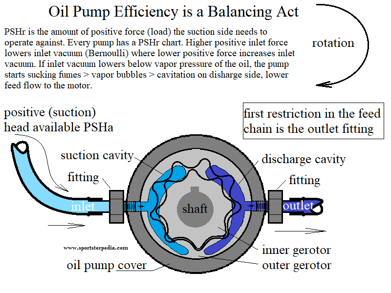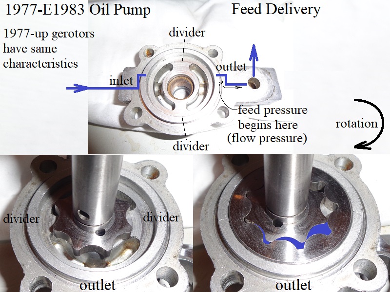 - Oil enters the engine from the pump but how it enters the engine is interesting. The outlet of the pump hits the bottom of the engine case as the hole in the case is offset. Oil has to travel forward and enter the case thru a 1/8” hole (restricting static pressure) where it immediately turns 90 degrees outward then into the cam cover to a 90 degree upward path. The pump cavity, the offset into the engine and the sharp quick turns are designed restrictions which raise static pressure and lower the flow pressure into the engine to the cam cover. The oil is slowed down before the 90 degree bends possibly to help stop turbulence at the bends. My understanding is turbulence strays from Bernoulli's principle somewhat. Then the oil has to travel uphill from there. According to Bernoulli's principle, elevation lowers head pressure. And that's all based off static pressure, oil speed and height.