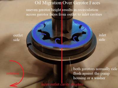 This lowers flow thru the pinion shaft to the crankpin. It also raises static pressure between the pinion shaft bushing and the top end. - This raises static pressure to the #2 cam squirter hole in the upper feed galley as well as the pressure available at the lifter bores.