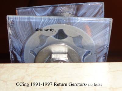 The smaller cam port cavity delivers oil to the bigger sump cavity and air fills what's left in that cavity. - With the sump port plugged;