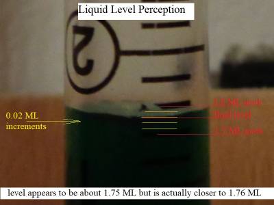 Deciding between the 2.5 ML mark and the 2.55 ML mark on the 3ML syringe used here places you somewhere between 2.40 and 2.65 mL actual volume used (4% accuracy). - All air bubbles have to be removed or they will cause errors in the results. A small amount of displaced air will change the final reading.