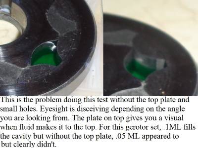 The holes drilled here were carefully done and scrubbed to ensure straightness across the hole. - The inner and outer gerotors have to be the same height during the test or leakage will appear on top and bottom faces.