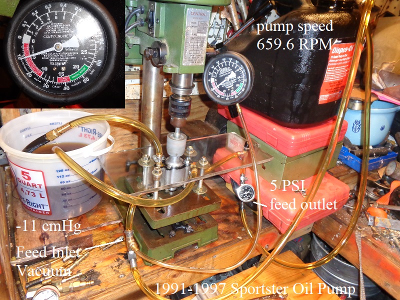 First, the container of oil for the cam chest inlet was hung above the drill press where the inlet hose was 25-1/2” above the pump (oil level 28“ above pump).
