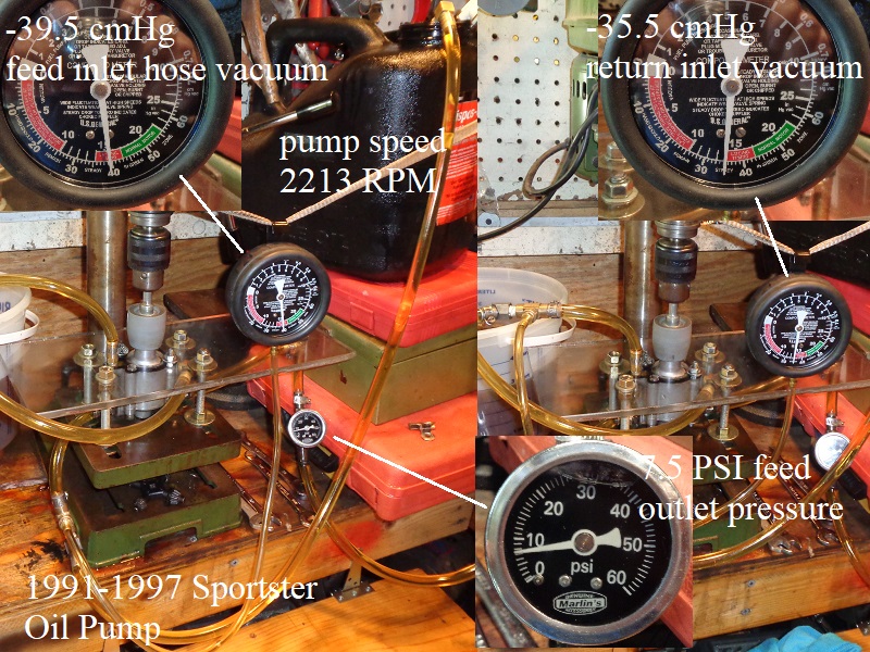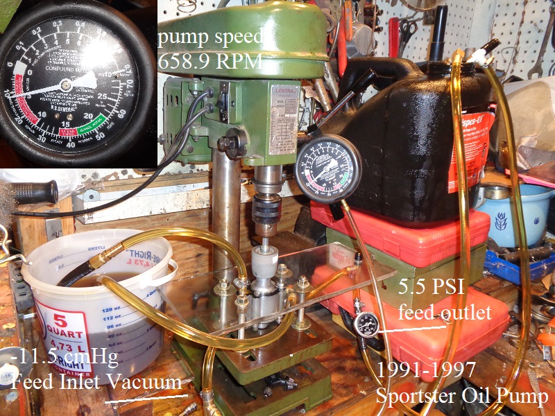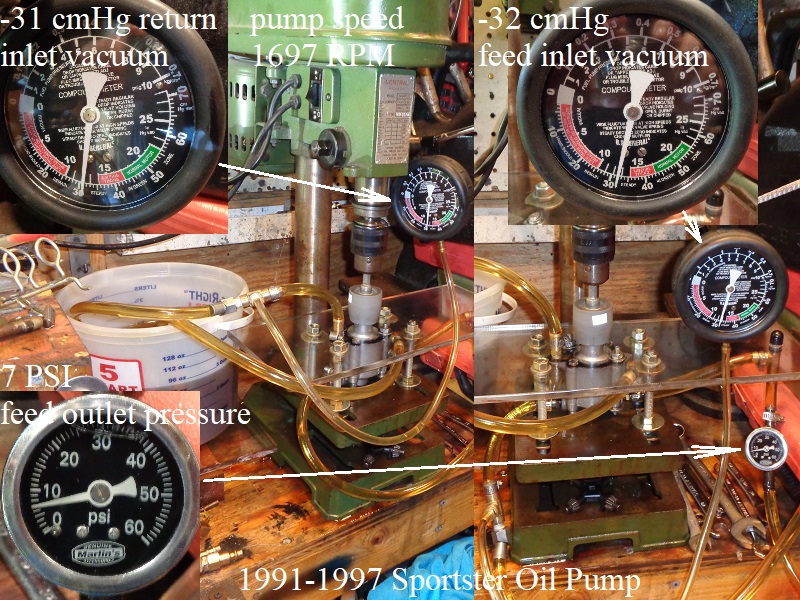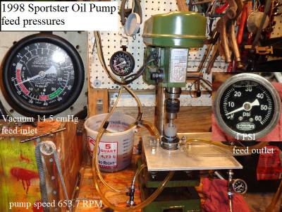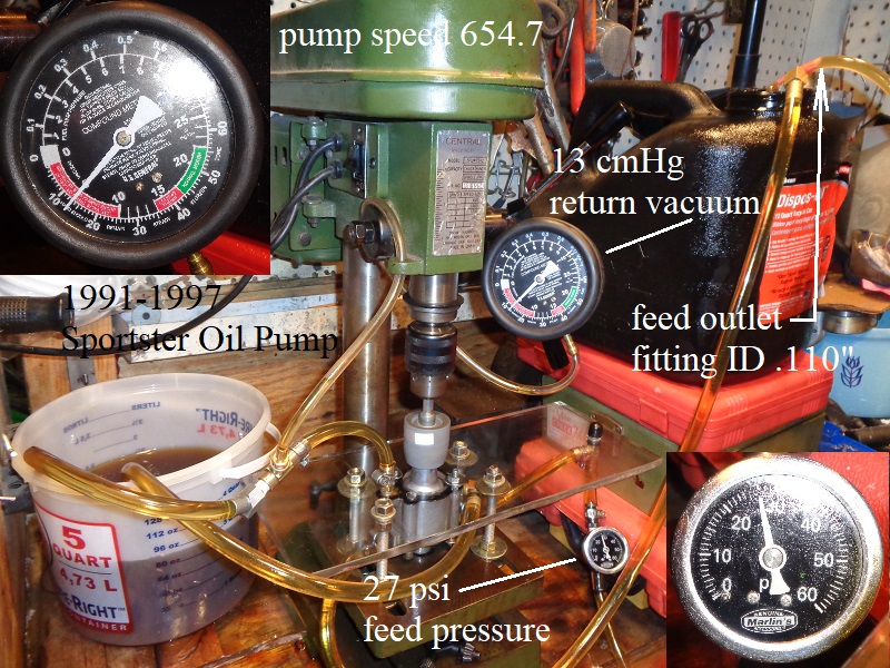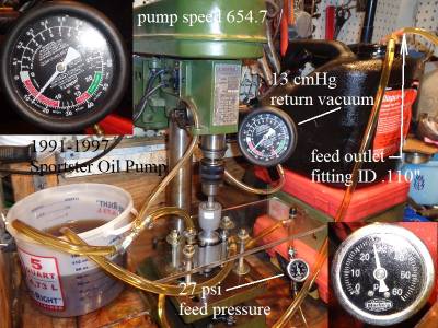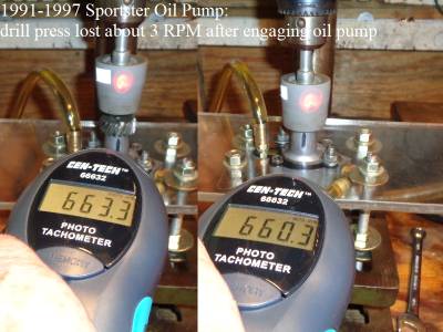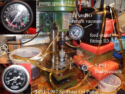 - 1991-1997 oil pump static pressures: Feed outlet fitting ID was changed for three tests which lowered RPM on the drill press.