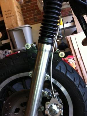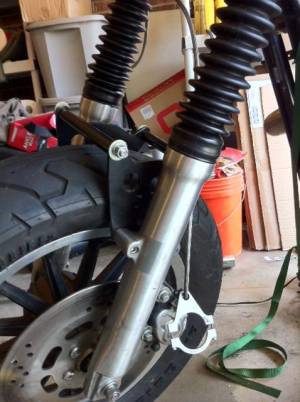 | Home made fork brace constructed from two 1/4“ steel plates, a hole saw, an angle grinder, some steel tubing and threaded rod. 1) | ||