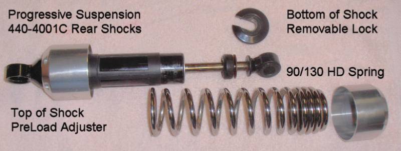 | If rider + luggage weighs 250# or more, Progressive recommends . . . . Rear Shock 440-4001 which has 90#/130# spring rate (Heavy Duty) |