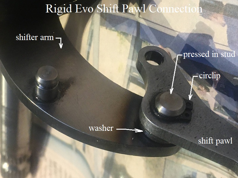 The shift pawl is attached to the shifter arm stud with a thick washer between them and a circlip on the end.