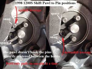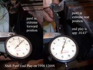 XLForum member, xLoneRiderx, measured app .197“ (5mm) of shift pawl end play at the tip on his pawl. 6)