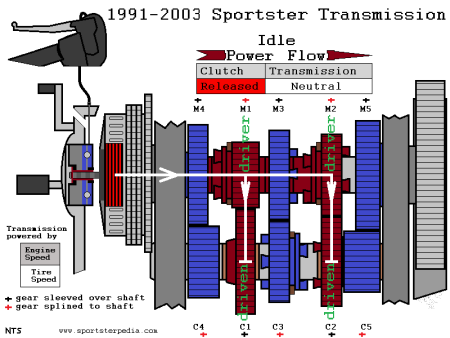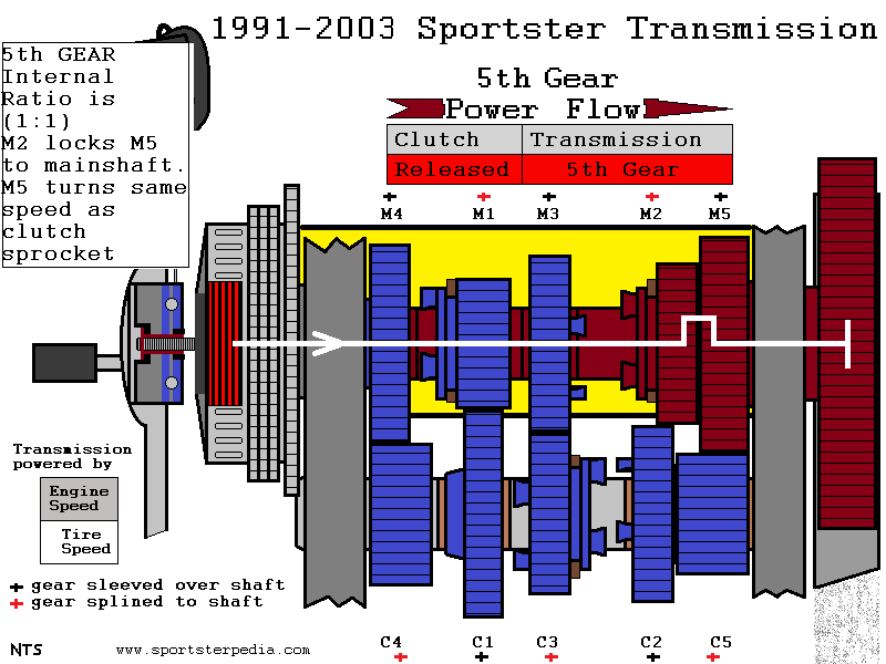 When the teeth are meshed together on the 2 separate shafts, one gear drives the other. The gear making the other move is called the driver gear and the other gear is being driven (thus driven gear). The driver gear is closest the power source. The power source is the engine by way of the engine sprocket (driver) which drives the mainshaft by way of the clutch sprocket (driven). The mainshaft receives power from the engine by way of the clutch. The clutch is between the engine and mainshaft and acts more like an on/off switch. With the clutch engaged, the mainshaft receives power from the engine. With the clutch dis-engaged, the mainshaft does not receive power from the engine. The mainshaft drives the countershaft in 1st-4th GEAR and the countershaft drives the M% and thus the transmission sprocket. And in 5th GEAR, the mainshaft drives M5 and thus the transmission sprocket, taking the countershaft out of the power flow.