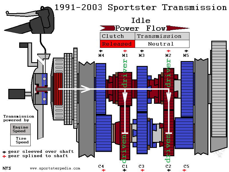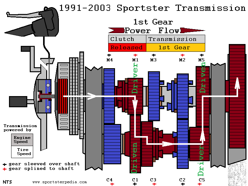 In the (left) drawing below, there are only 2 gears that are splined to the transmission mainshaft (M1 and M2 gears). The other 3 gears on the mainshaft are sleeved over bearings on the shaft and have to be locked to the mainshaft by way of either M1 or M3 in order to turn the shaft. There are '+' signs above/below each gear in RED or BLACK. Such as M4 has a BLACK '+' and C4 has a RED '+' and M1 has a RED '+'. The BLACK '+' gears are SLEEVED over the shaft on which they are located. This means they can turn separately from the shaft unless otherwise engaged. The RED '+' gears are SPLINED to the shaft on which they are located. This means they always turn whenever that shaft turns. Both M1 and M3 are sliding gears (as is C3) and they are moved by way of the shift forks when you move the shifter pedal.