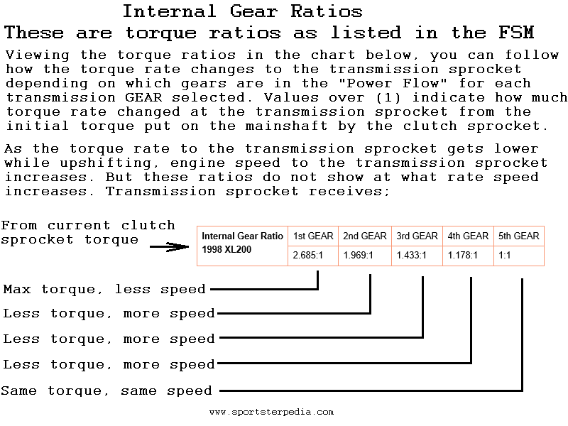 The internal gear ratio chart shows the rate of how the transmission gears reduce speed and increase torque to the transmission sprocket (accept 5th GEAR).