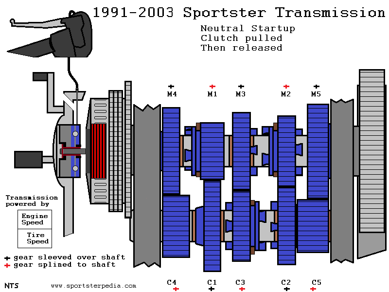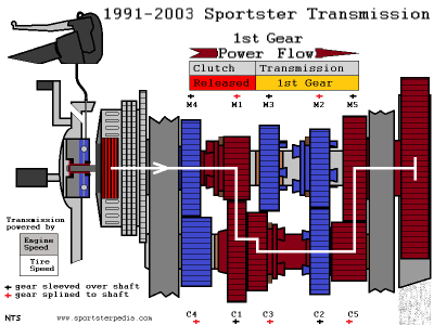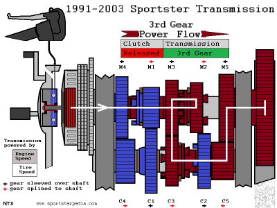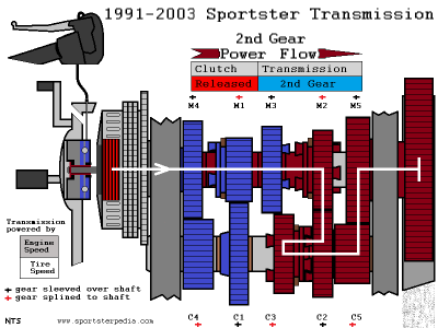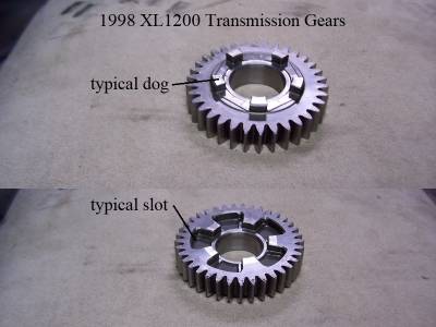 (Sportster) dog type transmissions don't have synchronizers to match gear speeds before engagement. So when you shift, the dogs just slam into the gear next to them. 9)