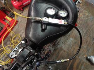 If allowed to move, it can quickly turn the engine over, while turning the rear wheel. (How much the bike will jump depends on the gauge/pressure you're using.) - Therefore, secure the wheel by applying the rear brakes or it will just turn over the engine and open the exhaust valve. 14)