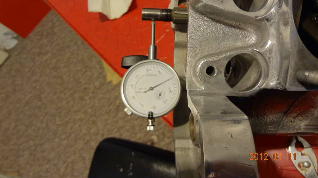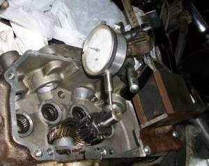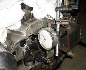 | Install a dial gauge on the holder with the pointer on the pinion shaft. Find the lowest spot while turning the engine over and 'zero' the indicator. 3) | This setup is made with a piece of angle iron for the magnetic base to stand on 4) | |