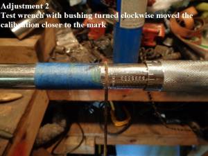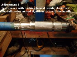 Subsequent adjustments and tests with the bushing turned counterclockwise put the test wrench back into calibration (as well as this test will do anyway).