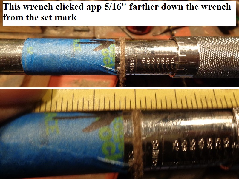 The test wrench below clicked 5/16” down the handle from the set mark.
