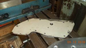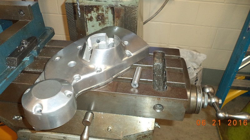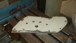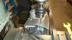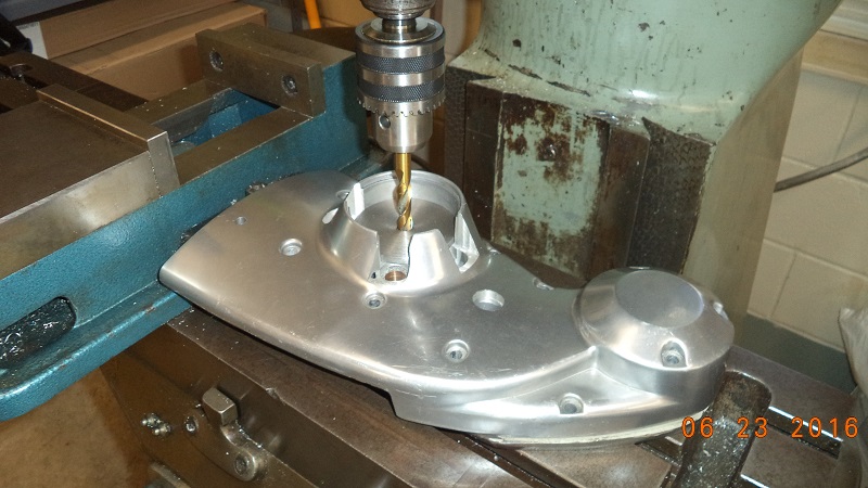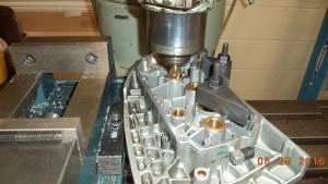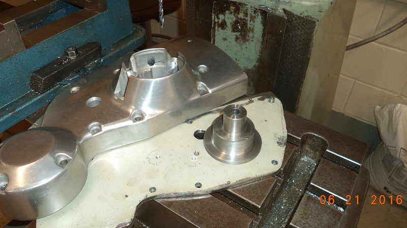 • I bought a used cam cover off Ebay to reverse engineer an installation plate for the right case cam shaft bushings. I started by setting the cover upside down and tightening it down using the timing cover boss as a horizon or parallel to the face. I found center of the cover bushings and milled a smaller bit through to the outside of the cover.