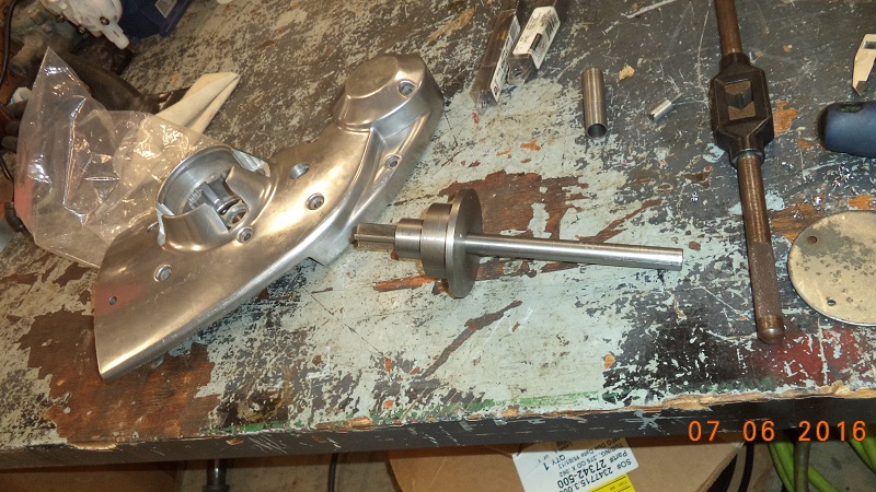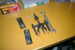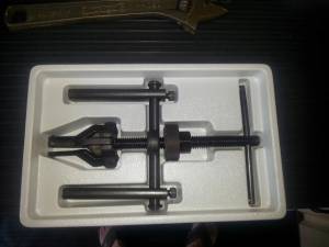 A gear puller shaft attached to a bearing separator for pressing the gear on #2 cam.