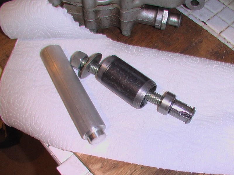 The puller is made from 1“ ID black pipe and 1/2”-13 threaded rod. You tap the flex head-puller head through the cam bearing.