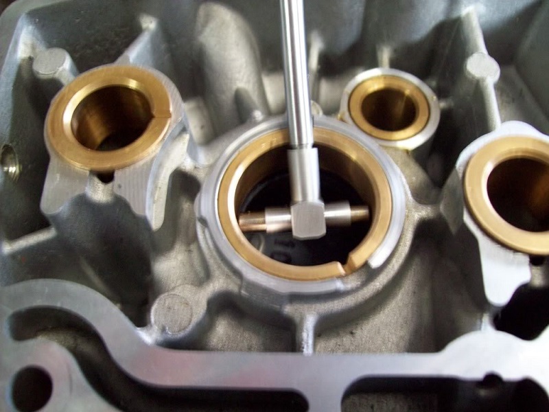 • The bushings in my original cam cover are all in spec so I don't have to change them out. This one only has four flutes….I'd rather have eight. Theoretically, the case and cover bushings are all 90 degrees from the mating surface, so you could ream each separately at 90 degrees and put them together as a unit. However, if you deviate off 90 degrees, then you change center and the 'out of service' clearance for these is only .003”.