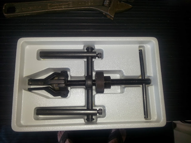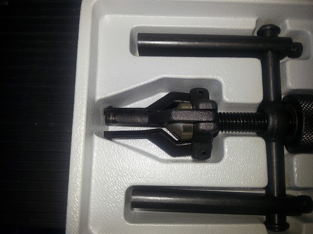 Blind Hole Bearing Puller (Harbor Freight model) 3) Decrease the width of the collet. Install it into and behind the bushing. Tighten the nuts to expand the collet.