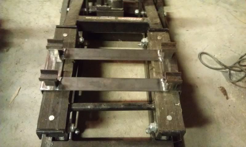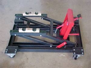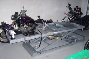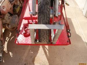 Then roll the bike into it, attach the tie down straps to stabilize the bike and then use the modified scissor jack to lift.