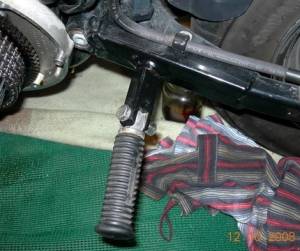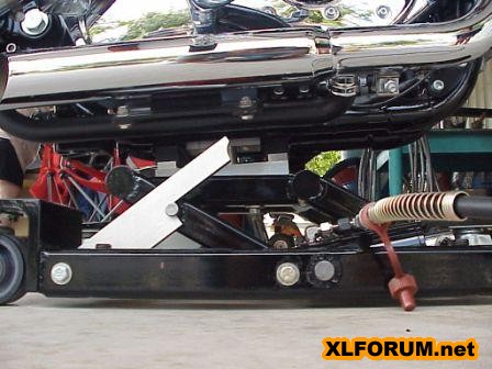 | Small Bike Jack 4) | Small Bike Jack under Bike 5) | The two hooks on this sport bike rear stand are designed to fit over special bobbins bolted to a modern sportbike swingarm and fit just perfect onto the bottom shock / footpeg mounts on the Sportster. 6) |