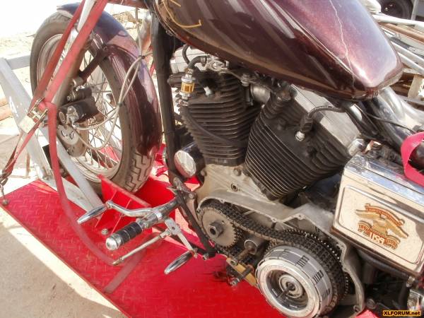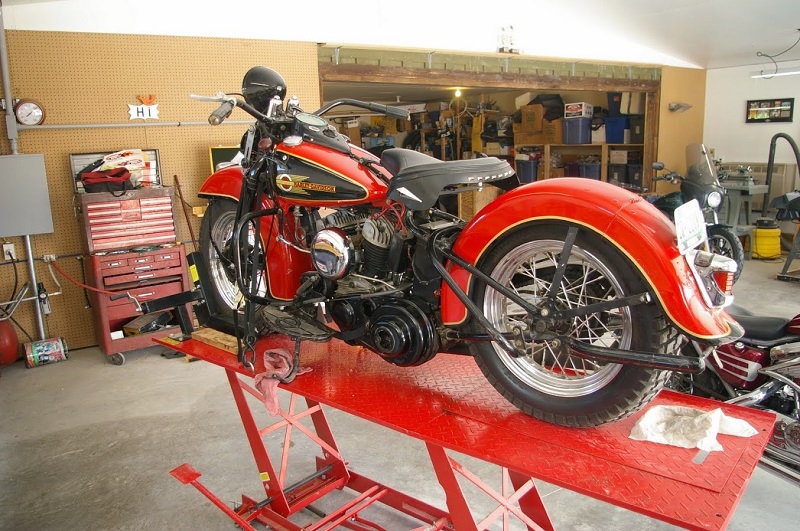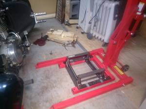 | Homemade locking hand lift made one out of scrap and it doesn't need tie-downs. This makes the bike stable enough to sit on, work on and even have both wheels off at the same time. 12) |