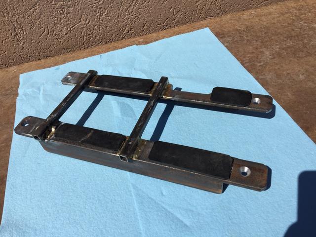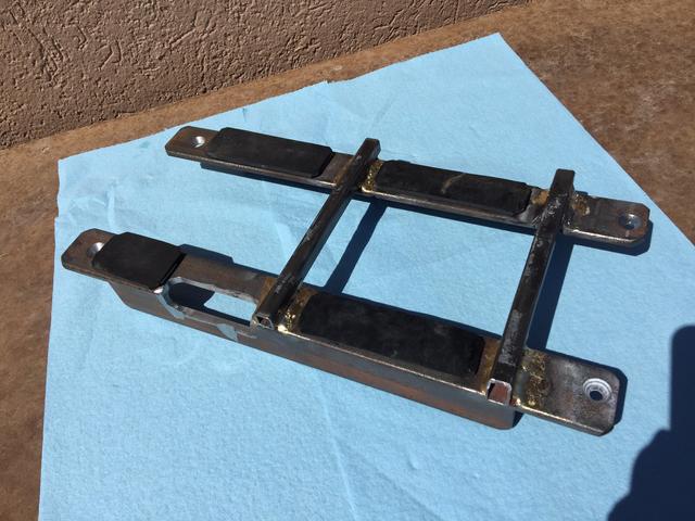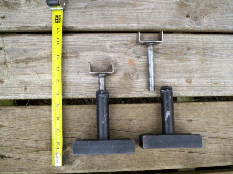 | Tie downs: bent 3/8” bar stock, cut to length, 'massaged' with a hammer in a vise to fit the sides of the mount and welded. Ears bent at 45°. The lowered height is 5.5“ to the top of the 1” square stock. 15) |