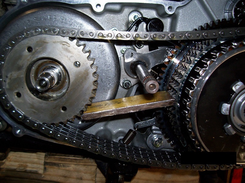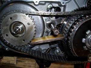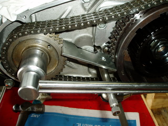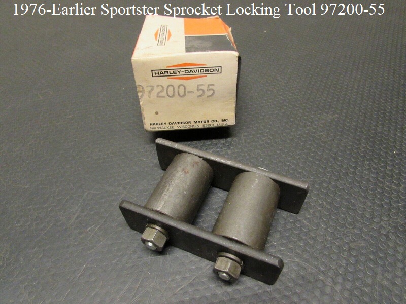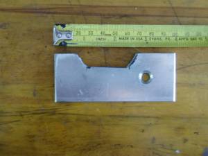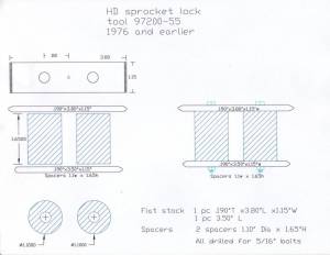 | This is the sprag I used to jam the clutch and engine sprockets to tighten the engine mainshaft nut (120 foot pounds). It has a divot cut out of it for the where the footpeg mount goes in a 77 model. It is right on 4“ long and made from about 1/4” flat strap. It is wide enough to fit on all three rows of the teeth on the sprocket. It is made from a piece of scrap metal so the countersunk hole is not necessary, just part of whatever it was before it became a special tool. It fits between the two sprockets to stop them from turning 5) |