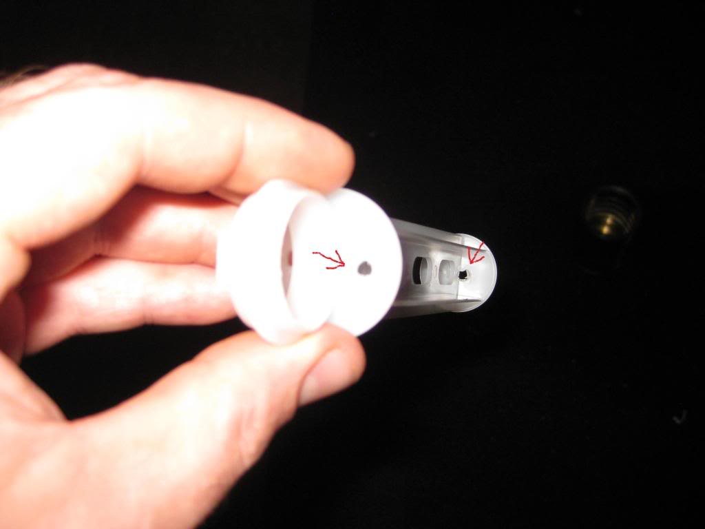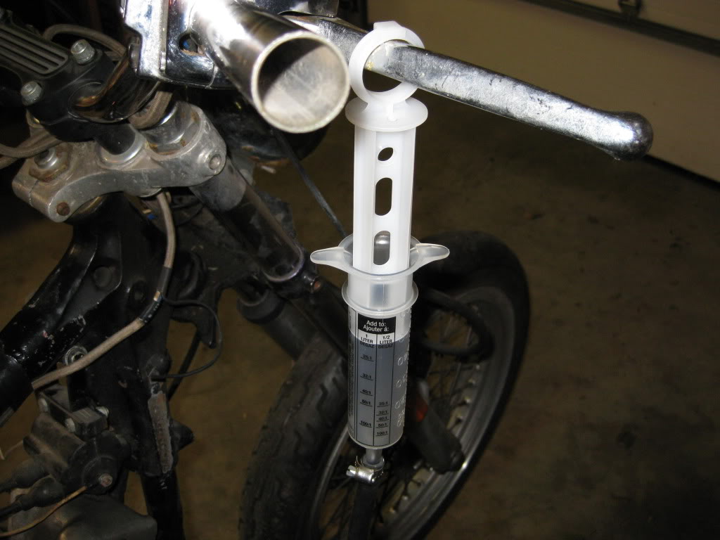 | You'll need a 1/4“ hose clamp and app. 3 feet 1/4” fuel line. Drill a small hole in both the top and bottom flange of the mixer to prevent vacuum / suction problems. 2) | Press one end of the fuel line onto the fuel mixer, tighten the hose clamp around it and the other end to your carb inlet. 3) | Fill the mixer with gas, tap the line to get the air bubbles out, insert the plunger, and hang the round end over the front brake lever. Works like a charm, no mess, and you can run the engine for several minutes while freeing up one of your hands. 4) |