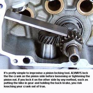 - It's very important to hold the crank on the pinion side with an appropriate pinion locking tool whenever you take the pinion nut off or put it on.If you hold the crank still from the primary side (or by putting the bike in gear and holding the brake), the twisting torque applied to the pinion nut gets transmitted through the crank, from one side to the other. The crank pin is not designed to resist much twisting force. You'll risk scissoring the crankshaft (knocking the crank out of true), which requires a full tear-down to fix. 8) So this is one of those situations where it's best to use the proper tool. 9)