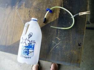 Below, the tube is an automotive shop one-way bleeder set up, but it goes inside the plastic bottle with a small hole in the lid. 22)