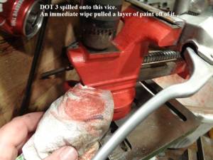 If using DOT3,4 or 5.1 then it needs to be hosed off with water immediately as these type fluids will eat your paint.